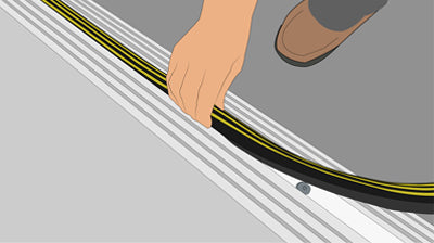 Starting from one end of the threshold, pinch the legs of the PVC black and yellow insert and push it in to the top of the threshold until it 'snaps into place'.