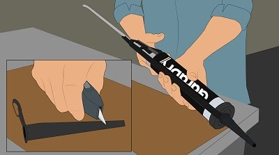 Use a hacksaw or sharp utility knife to cut the adhesive nozzle approx. ½” from the tip before fitting the tube into the sealant gun.